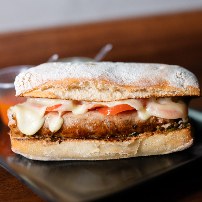 Pão Ciabatta, Linguicinha Caipira Artesanal, Chimichurri da casa, tomate e muçarela!